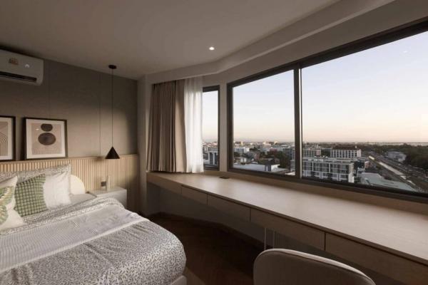 An open plan living room with a balcony overlooking the Doi Suthep mountain, canal roads, and also seeing planes take off & landing without any noise.