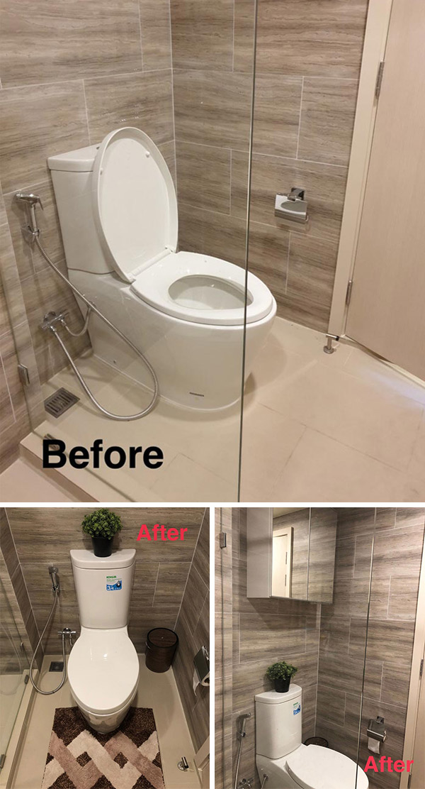 เดิม ๆ เลยค่ะ ซื้อแค่เครื่องทำน้ำร้อน พรม ถังขยะจากโฮมโปร และตู้เก็บของเหนือชักโครกจากอิเกีย