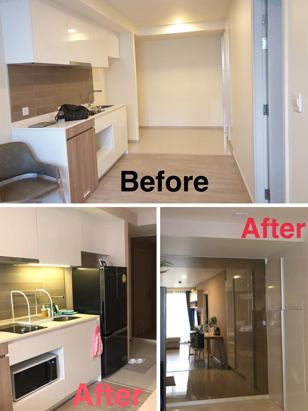 กระจกสีชาตรงผนังทางเข้า+ผ้าม่าน 2 ชั้น+วอลเปเปอร์ เป็นเจ้าเดียวกัน หาในพันทิปไปเรื่อย ๆ จนได้เจ้าที่ราคาโอเค บริการดีงาม ประทับใจมากค่ะ
