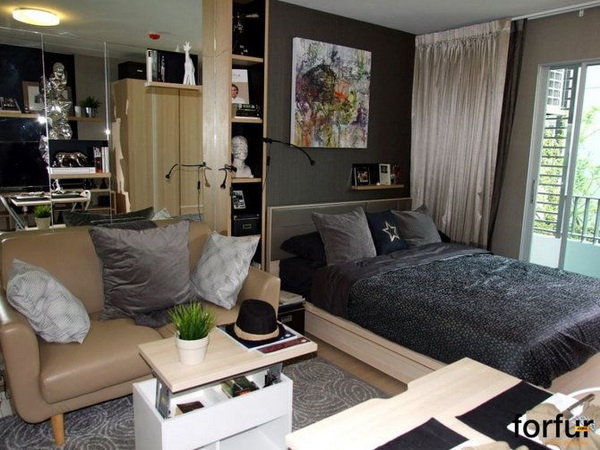 คอนโดแบบห้องสตูดิโอที่ทุกการใช้งานรวมอยู่ในพื้นที่เดียว การใช้เฟอร์นิเจอร์ให้น้อยชิ้นมากที่สุดจะช่วยทำให้พื้นที่เพียงพอต่อการอยู่อาศัย แต่ควรเลือกใช้เฟอร์นิเจอร์ที่สามารถใช้งานได้หลากหลาย อย่างโต๊ะกลางในห้องนั่งเล่นที่สามารถเป็นได้ทั้งโต๊ะวางของ พื้นที่จัดเก็บใต้โต๊ะ และสามารถปรับระดับให้สูงขึ้นเพื่อเป็นโซนนั่งทำงาน ก็พร้อมตอบโจทย์ทั้งพื้นที่ใช้งานที่จำกัดและความต้องการอันหลากหลายไปพร้อมกัน