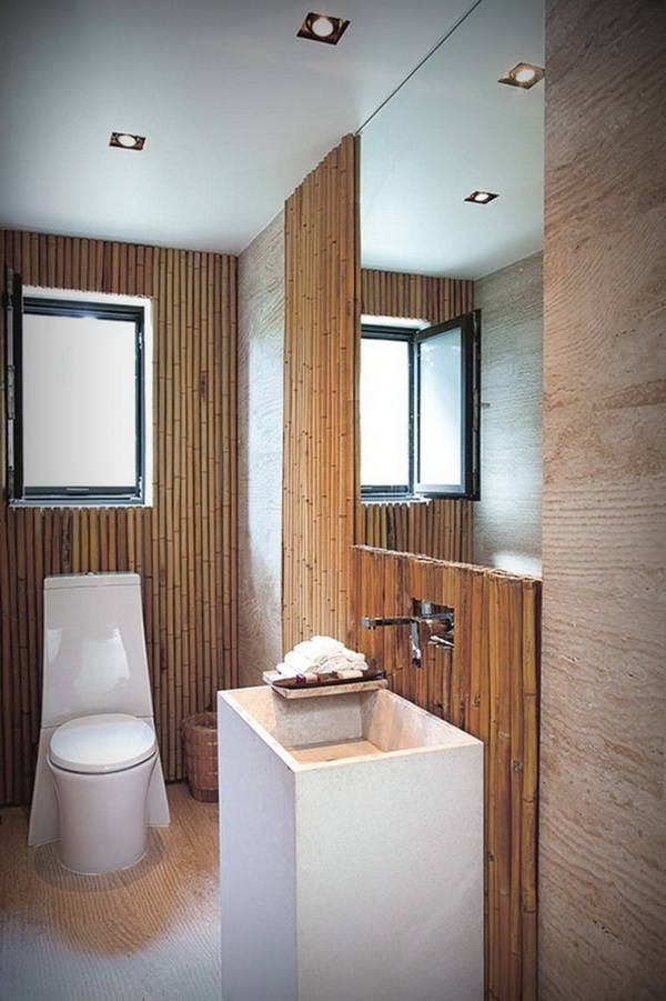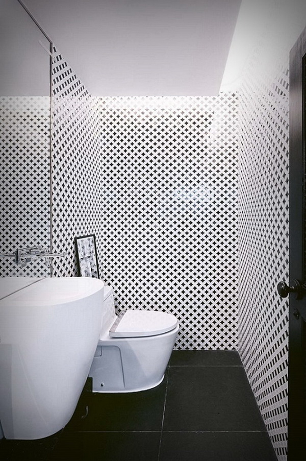 สามารถทำได้หลายวิธีไม่ว่าจะเป็นการเลือกโทนสีที่สว่างอย่างสีขาวเป็นหลักตามมาด้วยการกรุกระเบื้องขนาดเล็กอย่างกระเบื้องโมเสกหรือปูกระเบื้องลายขวางก็ช่วยให้ห้องน้ำดูกว้างขึ้นหรือหากใครอยากใช้กระเบื้องแผ่นใหญ่แนะนำให้ปูต่อเนื่องไปตั้งแต่พื้นไปจนถึงผนังประมาณครึ่งหนึ่งก็จะช่วยให้รู้สึกว่ามีพื้นที่ห้องน้ำเพิ่มมากขึ้นเสริมด้วยการติดกระจกเงาขนาดพอเหมาะ หรือเลือกกรุผนังด้านใดด้านหนึ่งรวมถึงโชว์งานฝ้าเพดานที่ช่วยให้ห้องน้ำดูโปร่งโล่งขึ้น