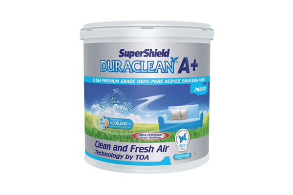ทีโอเอ ซุปเปอร์ชิลด์ ดูราคลีน เอ พลัส สำหรับทาภายใน ชนิดกึ่งเงา สีน้ำอะคริลิกเกรดอัลตร้า พรีเมียม นวัตกรรมใหม่ใส่ใจสุขภาพ มี Microban ช่วยป้องกันแบคทีเรียและเชื้อรา 99.99% ไม่ก่อให้เกิดภูมิแพ้ ระคายเคืองผิวหนัง และโรคทางเดินหายใจ มี Air Detoxify ช่วยลดสารฟอร์มาลดีไฮด์ในอากาศ ปราศจากสารระเหยเป็นพิษ VOCs. และสาร APEO ปลอดภัย ไร้กลิ่น เช็ดล้างทำความสะอาดง่ายกว่า 200,000 ครั้ง เหมาะสำหรับห้องที่ต้องการความสะอาดมากและเร็วเป็นพิเศษ ขนาดเริ่มต้น 1 แกลลอน ราคาประมาณ 969 บาท