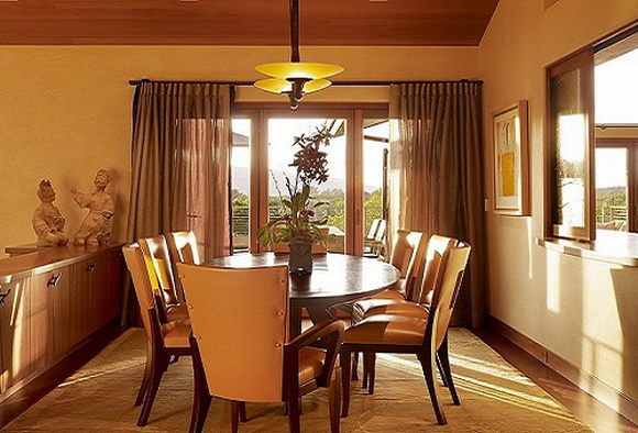 สำหรับบรรยากาศงานเลี้ยงที่ต้องการความเป็นกันเอง ส่วนเก้าอี้ให้เลือกรูปแบบที่นั่งสบาย มีสัดส่วนที่เหมาะสมกับขนาดของโต๊ะ และควรเว้นพื้นที่โดยรอบเก้าอี้ให้มีที่ว่างอย่างน้อย 1.0 เมตร เพื่อให้สามารถเลื่อนเก้าอี้ และเดินเสิร์ฟอาหาร โดยรอบได้ ส่วนโคมไฟเหนือโต๊ะอาหารนั้น ถือเป็นส่วนประกอบสำคัญที่ทำให้บรรยากาศการรับประทานอาหารเปลี่ยนไปได้ตามลักษณะของโคม และประเภทของหลอดไฟที่ใช้ ระยะที่เหมาะสม ในการแขวนโคมไฟควรอยู่ที่ประมาณ 1.50 เมตร จากระดับผิวโต๊ะ ทั้งนี้ เพื่อให้ได้แสงที่พอดีกับการใช้งาน และไม่บดบังระยะสายตาระหว่างคู่สนทนาในการรับประทานอาหาร