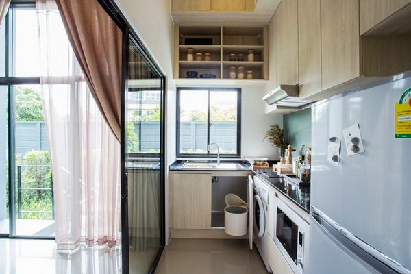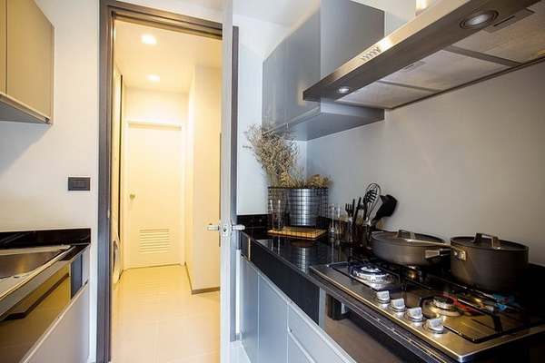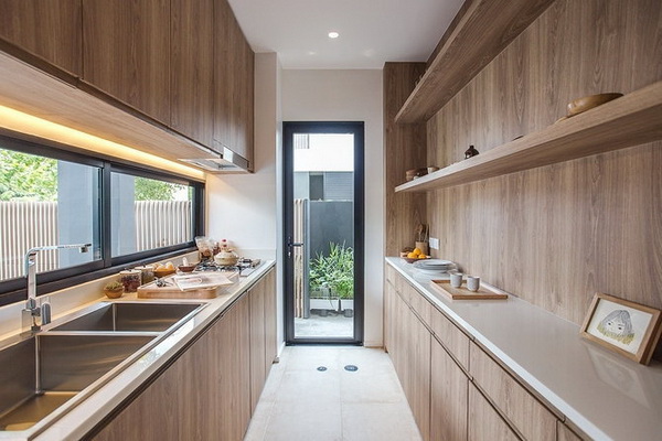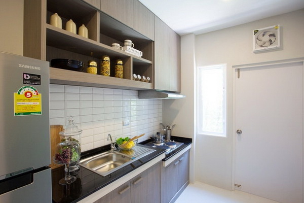 สำหรับห้องครัวที่มีพื้นที่พอประมาณ แต่ต้องการใช้งานพื้นที่มากกว่าเดิม แนะนำให้แบ่งสเปซการใช้งานในห้องครัวออกเป็นสองส่วน จัดวางเคาน์เตอร์ซิงค์ล้างและส่วนปรุงอาหารไว้ด้านละข้างของผนัง เพิ่มมิติให้ห้องครัวด้วยการเลือกใช้เฉดสีเข้มและอ่อนในการตกแต่งร่วมกัน เพียงเท่านี้ห้องครัวแสนสวยก็พร้อมให้คุณปรุงอาหารมื้อโปรดได้อย่างไม่มีเบื่อ