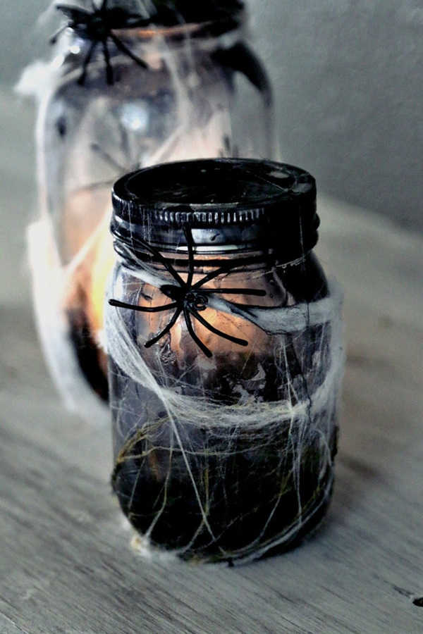 วิธีทำโคมไฟใยแมงมุมของ เริ่มแรกให้เทน้ำยาทาเล็บสีดำลงในถ้วย จากนั้นใช้น้ำเปล่าช่วยให้สีกระจายตัว แล้วจุ่มก้นขวดโหลลงไปพร้อมหมุนให้รอบทิศ ทำรอยเลอะแบบธรรมชาติ อย่าลืมจุ่มฝาและปากขวดลงไปด้วย เหลือไว้แค่เพียงตรงกลางเท่านั้น โดยขั้นตอนนี้เป็นการเพิ่มความเก่าแก่และความน่ากลัวให้กับขวดโหล หลังจากนั้นก็รอจนสีแห้งแล้วใส่เทียนทีไลท์เข้าไป เสร็จแล้วติดกาวและใส่ใยแมงมุมปลอมด้านใน และจัดแมงมุมให้อยู่ในจุดที่เหมาะสมได้ตามใจชอบ จุดไฟ ปิดฝา เท่านี้ก็เป็นอันเสร็จเรียบร้อย แต่ถ้าหากใครอยากเพิ่มความหลอน จะนำใยแมงมุมปลอมมาพันรอบนอกขวดโหลแบบบาง ๆ อีกสัก 2-3 รอบ พร้อมทั้งติดแมงมุมปลอมอีกสักนิดหน่อยก็ยังได้