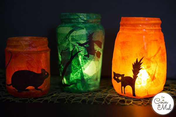 ไอเดียทำโคมไฟง่าย ๆ จากของใช้ใกล้ตัว ให้เริ่มต้นจากตัดกระดาษทิชชูหรือกระดาษสีออกเป็นชิ้นเล็ก ๆ จากนั้นทากาวให้ทั่วขวดโหลแล้วนำกระดาษไปติดแปะให้รอบ ควรทำซ้ำสองชั้นเพื่อความแน่นหนา สวยงาม สุดท้ายตัดกระดาษลายเงาดำ ๆ ตามใจชอบ ทากาวและนำไปแปะทับบนขวดโหล กด ๆ ทับ ๆ ให้เรียบติดสนิท รอจนแห้ง ก็จะมีโคมไฟแต่งบ้านวันฮาโลวีนง่าย ๆ แถมเด็ก ๆ สามารถทำได้ไม่ยากด้วย