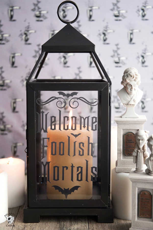 โคมไฟบ้านผีสิงของ ได้แรงบันดาลใจมาจากภาพยนตร์เรื่อง The Haunted Mansion บ้านเฮี้ยน ผีชวนฮา ซึ่งวิธีทำอีซี่มากเว่อร์ เพียงแค่หาโคมไฟทรงโบราณมาสักอัน หรือถ้าหากไม่มีจะใช้กล่องกระจกสีเหลี่ยมแทนก็ได้ จากนั้นก็เข้าไปดาวน์โหลดรูปภาพหรือข้อความที่ www.polkadotchair.com ปรับขนาดให้เหมาะสมกับโคมไฟของตัวเอง ปริ้นให้สวยงาม พร้อมตัดให้เรียบร้อย เสร็จแล้วออกแบบและจัดวางตำแหน่งให้เป๊ะ สุดท้ายก็ติดกาวและแปะลงไปให้ตรงจุด ง่าย ๆ เท่านี้ ก็มีโคมไฟเก๋ ๆ สำหรับวันฮาโลวีนแล้ว