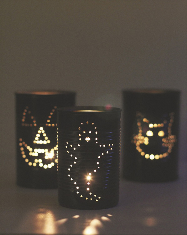 ใครมีกระป๋องเปล่าเหลือใช้ อยากรีไซเคิลให้เกิดประโยชน์ นำมาทำโคมไฟฮาโลวีนจากกระป๋องเก่ากันดีกว่า โดยขั้นแรกให้ทำความสะอาดเอาคราบกาวออกจากกระป๋องก่อน จากนั้นพรินต์แพทเทิร์นลายที่ต้องการ เช่น ผี ฟักทอง หรือแมวดำ ตัดให้เรียบร้อยและติดให้สวยงาม หลังจากนั้นวางกระป๋องไว้บนผ้า แล้วใช้ตะปูกับค้อนเจาะรูตามขอบของแพทเทิร์น พอเสร็จก็แกะแพทเทิร์นออกและพ่นสีดำลงไปให้ทั่ว สุดท้ายใส่หลอดไฟลงไปในกระป๋อง แค่นี้ก็พร้อมใช้งาน สวยเก๋ น่ากลัว แต่มีเสน่ห์ชวนมองไม่แพ้ใคร
