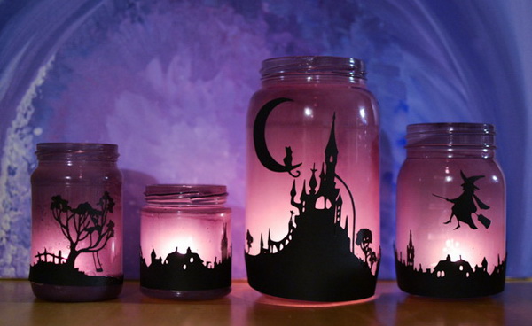 อีกหนึ่งโคมไฟฮาโลวีนที่มีเสน่ห์ชวนมองมากต้องยกให้กับโคมไฟเงา ซึ่งมีวิธีทำ คือ นำขวดโหลใสมาล้างทำความสะอาดให้เกลี้ยง แล้วพ่นสีสเปรย์ลงไปในทั่ว ขอแนะนำให้ใช้สีม่วงเพื่อความสวยงามเข้าธีม พยายามพ่นสีบาง ๆ เพื่อให้แสงไฟเล็ดลอดออกมาพอดี จากนั้นนำปากกามาวาดและระบายสีตามใจชอบ สำหรับคนที่ไม่ถนัดงานศิลปะ ให้หารูปภาพใส่ลงไปในขวด ทาบและวาดตามแบบ พร้อมลงสีให้ทึบสวย สุดท้ายใส่หลอดไฟลงไปกลางขวดโหลและเปิดสวิตซ์ รับรองสวยแจ่มเหมือนโคมไฟราคาแพง แถมยิ่งอยู่ในที่มืด ก็ยิ่งสวยขึ้นกว่าเดิมเป็นกองเลยทีเดียว