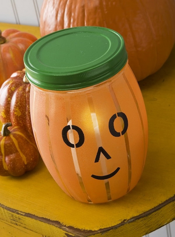 ไม่ต้องแกะสลักฟักทองจริง ก็มีโคมไฟลายฟักทองได้ ไม่เชื่อตามมาดูไอเดีย ที่มาพร้อมกับขั้นตอนสุดง่าย ได้แก่ นำเทปกาวไปติดตามแนวนอนให้รอบขวดโหล จากนั้นแกะออกมาทาบกับไม้บรรทัด พร้อมทำจุดเว้นระยะทุก ๆ 1 นิ้ว หรือกะขนาดให้พอดีกับความกว้างของขวดโหล เสร็จแล้วนำเทปกลับไปติดที่ขวดอีกครั้ง ต่อมาตัดเทปยาวไปติดตามจุดที่เขียนไว้ในแนวตั้ง ติดให้ครบทุกจุดแล้วตัดเทปแนวนอนออก หลังจากนั้นทาสีส้มให้ทั่วช่องว่าง รอจนสีแห้งแล้วจึงแกะเทปออก ก็จะได้เป็นลวดลายฟักทองสวยงาม ใส่หลอดไฟลงไป พร้อมหาฝามาผิด ขอแนะนำให้ใช้ฝาสีเขียวเพื่อความเก๋ไก๋สมจริง สุดท้ายตัดกระดาษสีดำเป็นตา จมูก ปาก และติดตกแต่งได้ตามใจชอบเลย