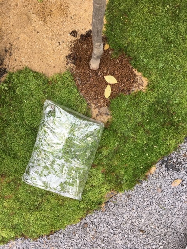 ใกล้เสร็จแล้วครับ จากนี้ก็หามอสครับ เสิร์ช ๆ เอาในเฟซบุ๊กเหมือนเดิม ไปเจอเพจขายมอสอยู่ที่เชียงใหม่ เขาขายเป็นแผ่น ๆ ขนาด 50x50 เซนติเมตร ตกแผ่นละ 380 บาท ตอนแรกกะดูคร่าว ๆ น่าจะใช้ประมาณ 4 ตารางเมตร บวกลบคูณหารดู โอ้โห ต้องใช้ 16 แผ่น ตก 7,000 กว่าบาท เลยลดพื้นที่ลงหน่อย เอามาแค่ 3 ตารางเมตรพอครับ เดี๋ยวไปเพิ่มต้นไม้เอา จะได้มีพื้นที่ปูมอสน้อยลง โอนเงินไปปุ๊บ สองสามวันของก็ส่งมาถึงครับ มาเป็นห่อ ๆ พลาสติกแบบนี้เลย ก็เอาออกมาปูเป็นแผ่น ๆ แอบยากนิดนึงเพราะมันขาดง่าย แต่ก็ไม่มีปัญหาอะไร เศษ ๆ ที่ขาดก็เอามาแปะ ๆ ต่อกันได้ไม่มีเสียของครับ ปูไปครึ่งวันก็ยังไม่เสร็จครับ พักเบรคค่อยมาปูใหม่วันรุ่งขึ้น