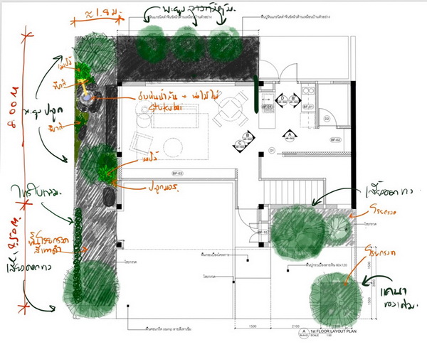ลองเอารูปมาสเก็ตช์ทับดูครับ ออกมาเป็นประมาณนี้ สวนที่อยากได้ อยากให้มองไปเห็นอ่างหินน้ำล้นกับไม้ไผ่ ซึ่งอันนี้ต้องมองเห็นได้จากห้องนั่งเล่นในบ้านด้วย ที่พื้นทางเดินโรยกรวด ด้านข้างเป็นเนินดินปลูกมอสเขียว ๆ ซึ่งไม่รู้จะเขียวได้แบบนี้หรือเปล่า เดี๋ยวมารอดูอีกทีครับ 555
