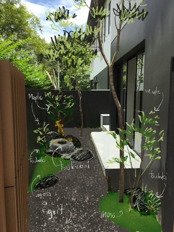 พื้นที่ด้านข้างส่วนนี้จะปลูกต้นไม้ใหญ่ไว้สองต้น เลือกเป็นต้นพะยูงเพราะชอบฟอร์มต้นกับใบที่ละเอียด ๆ ดูน่าจะเข้ากับสวนแนวนี้ครับ ส่วนต้นไม้อื่น ๆ ผมทยอยซื้อไว้ตั้งแต่เริ่มทำอินทีเรียข้างใน อยากได้ไม้ที่ใช้กับสวนญี่ปุ่นจริง ๆ เลยสั่งพวก Maple, Wisteria, Tsubaki และ Camelia พวกนี้มาอนุบาลไว้ก่อน บางอย่างก็เหลือรอดมาบ้าง บางอย่างก็บินกลับญี่ปุ่นไปแล้ว เช่น ซากุระ สั่งมา 3 ต้น ตายเกลี้ยง T_T เมเปิ้ลสั่งมา 3 ต้น เหลือรอดมาได้ต้นเดียว วิสทีเรียรอดทั้งสามต้น บางต้นก็งามดี บางต้นก็ดูร่อแร่ บางอย่างก็สั่งเป็นหัวมาปลูกเช่น Calla Lilly ซื้อมา 2 หัวก็งามดีครับ พวกนี้ผมเลี้ยงในกระถางริมระเบียงคอนโดไว้ก่อนเกือบครึ่งปี กว่าจะได้ฤกษ์ย้ายมาปลูกที่บ้าน