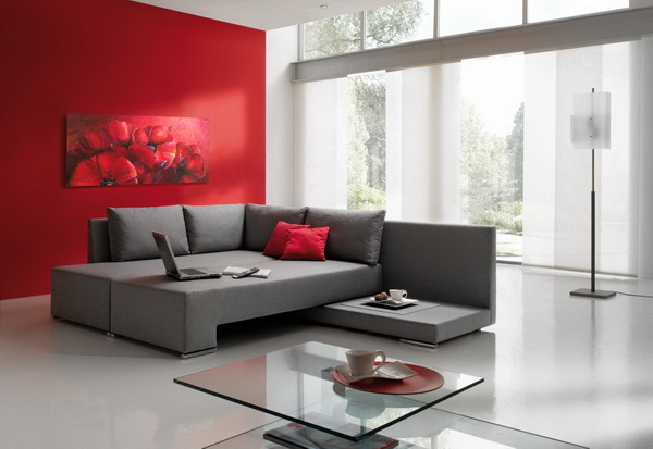 นอกจากสีส้มสุดสดใสแล้ว สีแดงก็นำมาจับคู่กับสีเทาได้เจ๋งไม่แพ้กัน โดยทางที่ดีเราควรเลือกใช้เป็นสีแดงกลาง ๆ ที่ไม่เข้มมากหรืออ่อนเกินไป เพราะจะได้ทำให้ห้องกลมกล่อมและลงตัวสไตล์คอนเทมโพรารี อีกทั้งการเพนต์ผนังเป็นสีเทา ยังช่วยให้ของตกแต่งหรือเฟอร์นิเจอร์สีแดงดูโดดเด่นมากยิ่งขึ้นอีกด้วย
