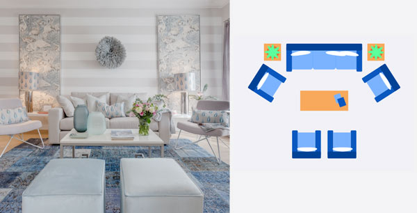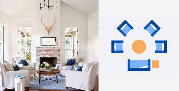 จัดเครื่องเรือนแบบสมมาตรกัน หรือ เท่ากันทั้งสองฝั่ง ตั้งแต่การเลือกโซฟา โคมไฟ รูปภาพ เพื่อสร้างมิติการมองที่เห็นทุกสิ่งเป็นคู่กันซ้าย-ขวา สร้างความรู้สึกเท่าเทียมกัน หรือดูเป็นทางการมากกว่าการจัดแบบอสมมาตร