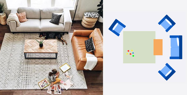 สำหรับบ้านที่มีเด็กเล็ก อาจจะจัดพื้นที่ตรงกลางของห้องนั่งเล่นเป็นพื้นที่สำหรับเด็ก โดยปูพรมที่เด็กสามารถเล่นและนอนได้ และจัดเก้าอี้อาร์มแชร์กับเก้าอี้โซฟาไว้รอบๆ ให้เป็นพื้นที่สนทนาของผู้ใหญ่ ลองทิ้งระยะออกมาประมาณ 1-2 เมตร และวางโต๊ะเตี้ยเพื่อเป็นขอบกั้นพื้นที่ระหว่างเด็กกับผู้ใหญ่ ซึ่งยังเป็นระยะที่เด็กยังอยู่ในสายตาของผู้ปกครองได้ แต่ก็ไม่ใกล้เกินไปที่จะทำให้เด็กอึดอัดครับ