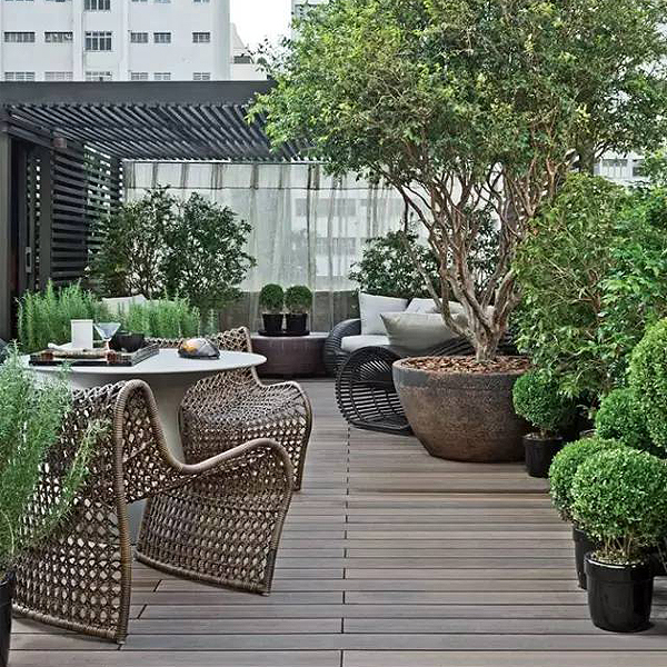สำหรับอาคารพาณิชย์ที่อาจจะมีพื้นที่น้อย ลองเลือกตกแต่งดาดฟ้าด้วยสวนกระถางเพราะสามารถซื้อมาจัดวางไว้เลย แต่ก็ต้องพิจารณาเรื่องการรับน้ำหนักของอาคารเช่นเดียวกัน แต่ถ้าเป็นต้นเล็กๆ ที่ไม่หนักมาก ก็สามารถจัดวางได้ตามใจชอบได้เลย โดยแนะนำให้จัดสวนกระถางเป็นจุดๆ เพื่อเน้นให้เกิดจุดเด่น อาจจะตกแต่งด้วยรูปปั้น น้ำพุ ป้าย ต่างๆ เพื่อเพิ่มความน่าสนใจ ทั้งนี้การเลือกต้นไม้ควรเลือกให้มีระดับความสูงแตกต่างกัน และไม่ควรให้มีสีสันมากเกินไป เพื่อคุมโทนให้สวนเป็นรูปแบบเดียวกัน