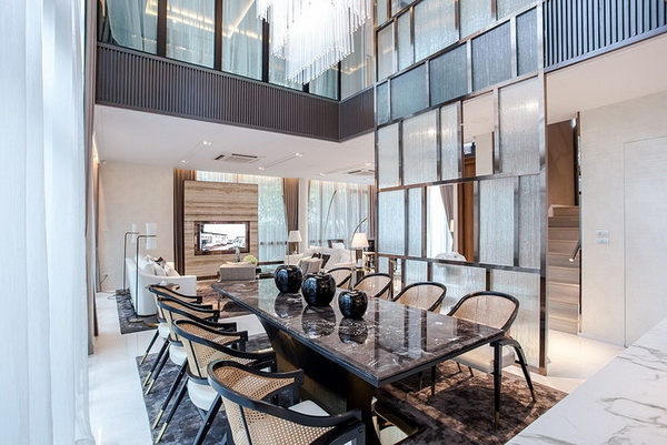 การตกแต่งบ้านด้วยวัสดุที่มีความมันวาวคือหนึ่งในแนวทางการแต่งบ้านที่สามารถเพิ่มความสวยหรูชวนสะดุดตาให้มุมบ้านน่ามองมากยิ่งขึ้น ซึ่งเหมาะสำหรับการนำมาใช้ตกแต่งภายในบ้านที่มีโถงเพดานสูงเป็นอย่างยิ่ง เพื่อช่วยเสริมความหรูหราให้บริเวณบ้านโถงเพดานสูงดูโดดเด่นจากวัสดุที่มีความแวววาว โดยอาจนำวัสดุกระจกไฮกลอสที่มีพื้นผิวมันวาวมาตกแต่งเป็นส่วนพาร์ทิชั่นเพื่อกั้นความเป็นส่วนตัว หรืออาจเลือกใช้เฟอร์นิเจอร์ที่สร้างสรรค์ขึ้นจากวัสดุมันวาวก็ได้เช่นกัน