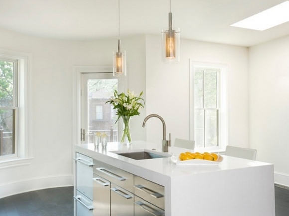 โคมไฟติดเพดานในครัวอันเดิมที่ใช้มานานแล้ว ทำให้คุณเบื่อหน่ายจนอยากจะซื้ออันใหม่มาเปลี่ยน ลองหยุดความคิดที่จะซื้อใหม่ แล้วหันมาแปลงโฉมโคมไฟอันเดิม ให้กลายมาเป็นแบบห้อยด้วยสายลวดยาวจากบนเพดาน เพราะโคมไฟแบบนี้จะช่วยให้ห้องครัวห้องคุณดูโมเดิร์นขึ้นเป็นกองเลยค่ะ