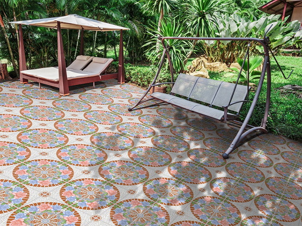 แทรกความหวานในลานสวนด้วย กระเบื้องลายลานบุปผาชาติ กระเบื้องปูพื้น ผิวแมท ที่มีลวดลายของดอกกุหลาบหลากสี สลับลายด้วยเกร็ดหินสีขาว สีเอิร์ธโทนวางเรียงกระจายดูเป็นธรรมชาติ เมื่อนำกระเบื้องมาปูต่อลายในลานสวนรอบบ้าน ก็ช่วยเนรมิตให้พื้นที่ดูมีดีไซน์เก๋ๆ แต่ซ่อนหวานเล็ก ๆ กลมกลืนไปกับธรรมชาติอย่างกลมกลืน ข้อสำคัญเก็บกวาดใบไม้ทำความสะอาดได้ง่าย