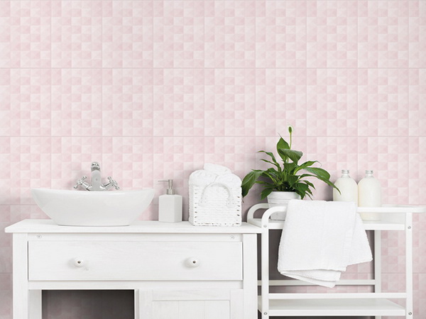 อีกหนึ่งห้องที่สำคัญของบ้าน คือ ห้องน้ำ สำหรับคู่รักสายหวาน ขอแนะนำกระเบื้องบุผนัง ลายพีระมิด - ชมพู เป็นกระเบื้องที่ลายมิติมีความนูนบนผิวกระเบื้อง ตกแต่งด้วยสุขภัณฑ์และเฟอร์นิเจอร์สีขาว ทำให้ห้องน้ำมีสไตล์แบบโมเดิร์น สีหวาน สบายตา