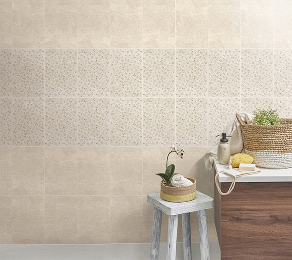 หากชอบแนวสีพาสเทล ขอแนะนำกระเบื้องบุผนัง ลายโบลตัน ฟลอร่า - เนื้อ มีลวดลายเป็นดอกกุหลาบ เล็กๆ และดอกไม้นานาพันธ์ ปูสลับกับลายโบลตัน - เนื้อ มีต้นแบบของลวดลายมาจากหิน QUARTZ เลือกเฟอร์นิเจอร์แบบง่ายๆ ใช้วัสดุทำจากธรรมชาติ ทำให้เป็นห้องน้ำสไตล์ Mix & Match ที่มีความลงตัวดูนาน ๆ ไม่น่าเบื่อ