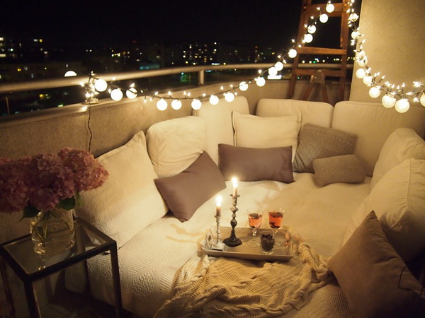 บอกก่อนว่าไอเดียนี้ต้องมีระเบียงที่ค่อนข้างกว้างหน่อยนะ เพราะถ้าระเบียงเป็นแนวยาวแต่แคบอาจจะทำให้ดูอึดอัดไปหน่อย โดยมีการจัดวางโต๊ะ เก้าอี้ คลุมด้วยผ้าเล็กน้อย แสงเทียนอีกนิด ไวน์หรือแชมเปญสักขวด เหมือนเป็นการดินเนอร์สองต่อสองใต้แสงเทียน โดยที่ไม่ต้องออกไปทานข้าวข้างนอกให้วุ่นวาย แถมยังดูน่ารักอีกต่างหาก