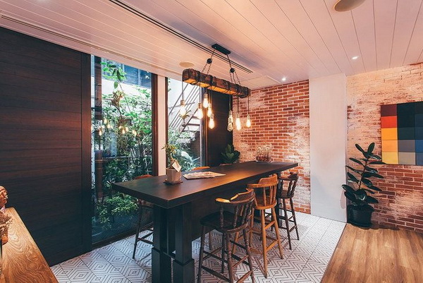 สำหรับบ้านที่มีพื้นที่ใช้สอยกว้างขวางขึ้นมาหน่อย อาจลองเลือกใช้โต๊ะยาวทรงสูงจัดวางคู่กับเก้าอี้สตูล เพื่อใช้เป็นพื้นที่นั่งทำงานที่ให้อารมณ์แบบร้านคาเฟ่นอกบ้าน พร้อมเพิ่มแสงสว่างให้มุมทำงานมากยิ่งขึ้น ด้วยการติดตั้งโคมไฟเหนือพื้นที่โต๊ะทำงาน ซึ่งสามารถ DIY ได้เองจากวัสดุเหลือใช้ที่มีอยู่ หรืออาจนำโคมไฟแบบตั้งโต๊ะมาใช้เป็นไอเท็มสำหรับส่องสว่างให้มุมทำงานก็ได้เช่นกัน เพียงเท่านี้ก็สามารถสร้างสรรค์พื้นที่ใช้สอยในบ้านให้กลายเป็นพื้นที่นั่งทำงานสุดคูลที่ไม่น่าเบื่ออีกต่อไป