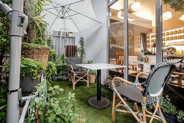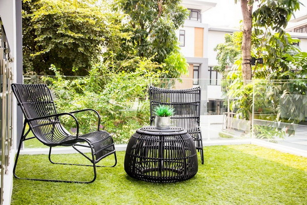 ออกแบบพื้นที่เล็กๆให้สอดคล้องไปกับไลฟ์สไตล์ของคนสมัยใหม่ ที่พักอาศัยอยู่บนคอนโดพื้นที่จำกัด มาปรับเปลี่ยนระเบียงตากผ้าให้กลายเป็นสวนสุดชิว ตกแต่งด้วยเฟอร์นิเจอร์ที่มีรายละเอียดบ่งบอกตัวตนของเจ้าของ สวนนี้เลือกปูหญ้าเทียมบนพื้นที่จำกัด นำโต๊ะเก้าอี้หวายทาสีดำมาจัดเรียง ประดับด้วยไม้กระถางเล็กๆ ง่ายๆเชื่อว่าทุกคนทำตามได้อย่างแน่นอน