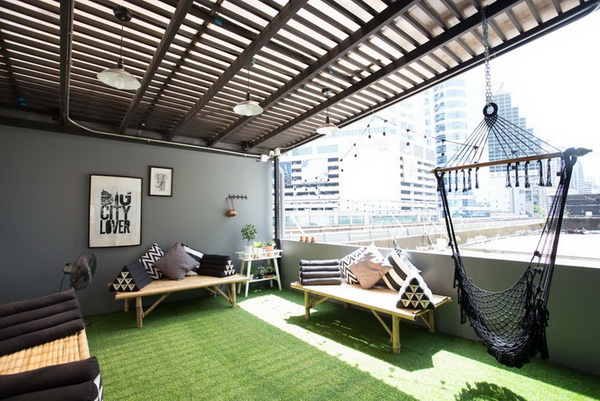 อย่างที่บอกไปตอนแรก ว่าการพักอาศัยอยู่ในเมืองหลวงนั้นจะให้ทุกบ้านมีพื้นที่อาณาบริเวณเหมือนกันหมดก็คงไม่ได้ สำหรับแบบบ้านใครที่เป็นตึกแถว มาสร้างสรรค์บรรยากาศดาดฟ้าให้แปลกตาไม่เหมือนใคร ด้วยการจัดสวนสไตล์ชิลๆ เหมือนนั่งเล่นอยู่ในชนบท เริ่มจากปรับพื้นที่โดยรอบให้พร้อม เปลี่ยนผนังเป็นสีเทาให้มีกลิ่นอายทันสมัยผสมกับพื้นหญ้าเทียม และเพิ่มรายละเอียดให้การจัดสวนด้วยแคร่ไม้ไผ่ วางไม้ประดับอยู่ตามจุดต่างๆ เติมความสดชื่นสบายตา