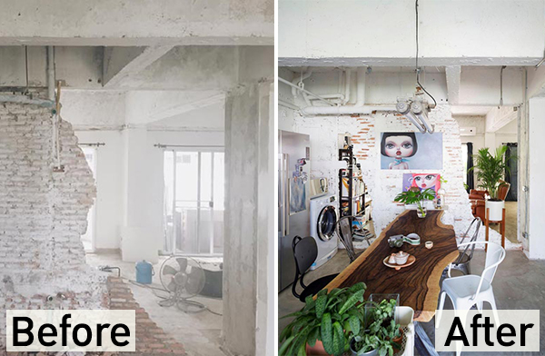 สเต็ปต่อมา จากความชอบดิบ ๆ อยากอยู่ในฟีล Apartment New York (ถามว่าเคยไปมั้ย ไม่เคยหรอกครับ 555 แต่เห็นจากในหนัง จากในรูปถ่ายตามแมกกาซีน ผมชอบฟีลแบบนั้น อยากอยู่ในสถานที่แบบนั้น) แต่... ย้อนกลับไปว่าสถาปนิกเรามีความญี่ปุ่นสูง 555 ทีนี้ต้องมาเจอกันตรงกลางล่ะ เคบอกกับผมเป็นคำแรกตั้งแต่จะทำแบบดิบ ๆ แล้วว่า พี่ทำดิบได้ แต่ผมขอให้ดิบบนความสะอาดนะ เพราะบ้านเวลาดิบมากเกินไป นาน ๆ มันจะดูสกปรก เราก็เออว่ะ มีเหตุผล เลยโอเค แปลนเดิมเป็นสองห้องนอน สองห้องน้ำเล็ก ๆ แล้วห้องนอนอยู่ฝั่งหน้าทางเดิน ผมก็เลยปรับแปลนใหม่ ให้ห้องนอนไปอยู่ข้างหลังแทน จะได้นอนหลับสบายขึ้น ไม่ต้องกลัวเรื่องเสียงรบกวน ส่วนห้องน้ำก็ยุบไปห้องนึงเพื่อเพิ่มสเปซฝั่งห้องครัวกับห้องนั่งเล่น