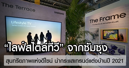 ‘ไลฟ์สไตล์ทีวี’ จึงกลายเป็นตัวเลือกที่สามารถตอบโจทย์ผู้ใช้ด้วยการก้าวข้ามขีดจำกัดของการออกแบบ ไม่ว่าจะเป็น The Frame (เดอะ เฟรม) ทีวีที่ผสมผสานดีไซน์ของกรอบรูปสุดพรีเมียม เพื่อเติมเต็มพื้นที่ในบ้านได้อย่างสมบูรณ์แบบ The Serif (เดอะ เซรีฟ) ผลงานดีไซน์สุดไอคอนิกจากความร่วมมือระหว่างซัมซุงและนักออกแบบเฟอร์นิเจอร์ชื่อดังระดับโลก The Sero (เดอะ เซโร) นวัตกรรมทีวีหมุนได้ ออกแบบมาเพื่อนำเสนอมุมมองการรับชมที่ดีที่สุดทั้งแนวตั้งและแนวนอน ที่คว้ารางวัลการออกแบบระดับโกลด์ จาก International Forum (iF) Design Award 2020 มาครอง และล่าสุดกับ The Terrace (เดอะ เทอร์เรซ) QLED TV ที่ถูกออกแบบมาเพื่อเติมเต็มไลฟ์สไตล์ภายนอกอาคาร ขยายขอบเขตความบันเทิงไปทุกพื้นที่ในบ้านอย่างไม่มีข้อจำกัด พร้อมกับมาตรฐานการกันน้ำ IP55 เพื่อป้องกันตัวเครื่องจากสภาพแวดล้อมที่เปลี่ยนไปในแต่ละวันอย่างเต็มที่
