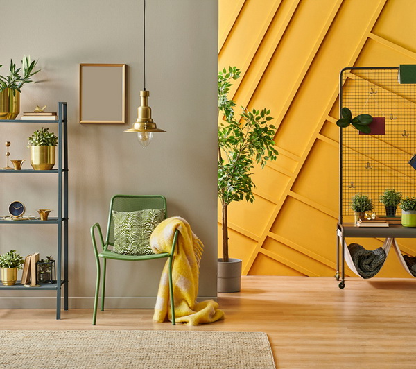 สำหรับผนังบ้านที่มีเลเยอร์พอจะเพนต์สีเล่นระดับได้ ขอแนะนำให้ทาผนังฝั่งหนึ่งเป็นสีเทา อีกฝั่งหนึ่งเป็นสีเหลืองดู บอกเลยง่าย ๆ แค่นี้ก็ช่วยให้บ้านดูทันสมัย มีลูกเล่น และมีมิติขึ้นได้ไม่น้อยเลยล่ะ