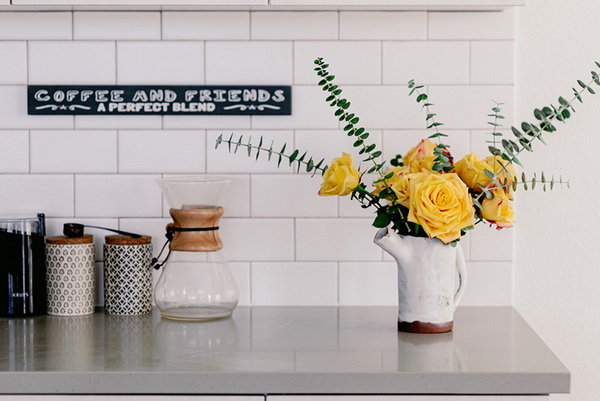 สำหรับการแต่งห้องครัวด้วยสีเหลืองและสีเทา อาจจะใช้ทั้งสองสีผสมกันผ่านบานตู้เคาน์เตอร์ หรืออาจจะใช้ท็อปสีหนึ่ง และหาของตกแต่งอีกสีหนึ่งมาวางประดับแทนก็ได้