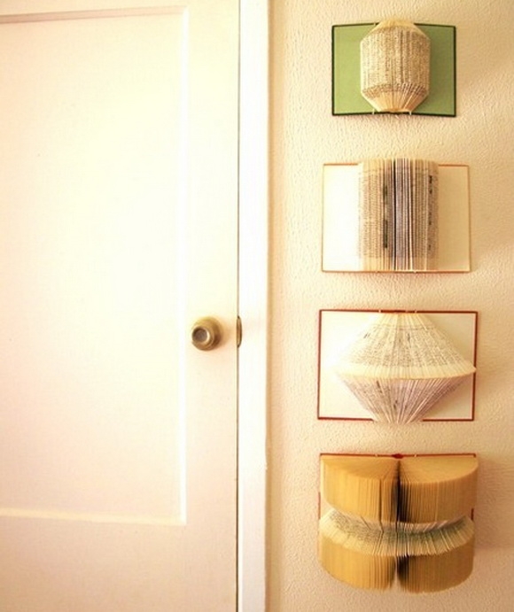 4. หนังสือเก่าๆก็นำมาดัดแปลงเป็นของแต่งผนังบ้านได้เช่นกัน ใช้หนังสือเล่มเก่าที่มีปกหนังสือหนาๆหน่อย นำมากลางออกโดยใช้ปกหนังสือหนาๆสำหรับใช้ยืดติดด้วยกาวสองหน้า หรือจะใช้การยึดน๊อต อย่างหลังจำเป็นต้องเจาะรูด้วยสว่าน เพื่อฝังปุกสำหรับใส่น๊อตยึด หลังจากการติดเรียบร้อยแล้วเราก็ตัดแต่งขอบกระดาษด้วยกรรไกร ตกแต่งตามใจได้เลยรับรองสวยแจ่ม