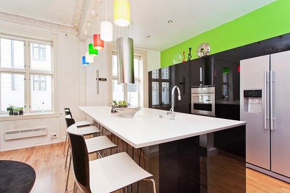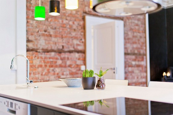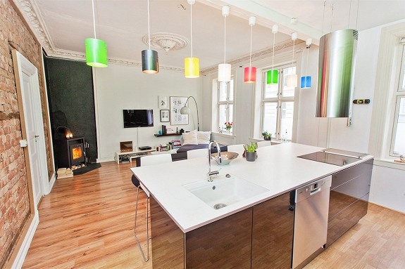ด้วยลักษณะห้องที่เป็นแนวยาวดูโล่งตาแต่ถ้ากั้นแบ่งเป็นสองห้องเพื่อแยกเป็นห้องครัวและห้องนั่งเล่นก็จะทำให้แต่ละห้องมีขนาดที่ดูแคบลง ไอเดียการตกแต่งห้องครัวโดยการรวมเข้ากับห้องนั่งเล่นให้อยู่ในห้องเดียวกัน จึงทำให้สามารถใช้พื้นที่ของห้องได้อย่างคุ้มค่า เพราะนอกจากจะสามารถตกแต่งห้องครัวที่สวยงามและตกแต่งห้องนั่งเล่นที่น่ารักแล้ว ยังทำให้ทั้งห้องดูโล่งกว้าง มีพื้นที่ใช้สอยมากขึ้นสะดวกสบายและไม่อึดอัด