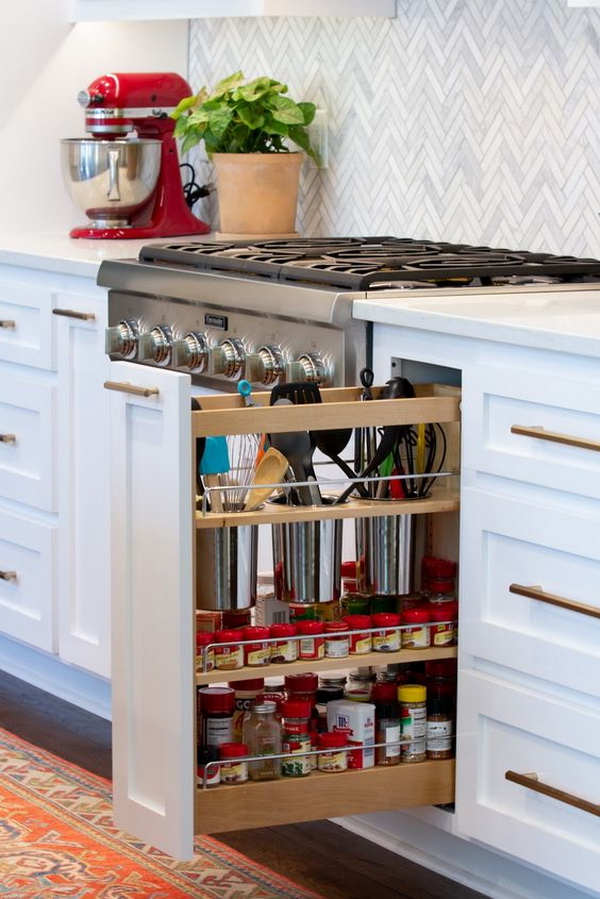 พื้นที่ขนาดเล็กแบบนี้ ทำให้ไม่สามารถวางเครื่องครัว เครื่องปรุงได้อย่างเต็มที่ คุณลองเลือกดีไซน์ลิ้นชักที่จัดเก็บแบบแนวตั้งดูสิ เป็นการจัดเก็บของได้ดีเหมือนกัน แถมไม่เปลืองพื้นที่ห้องครัวที่มักจัดเก็บของแบบแนวราบด้วย ซึ่งการจัดเก็บในแนวตั้งแบบนี้สามารถเพิ่มพื้นที่เก็บของได้ถึงเพดานเลยทีเดียว