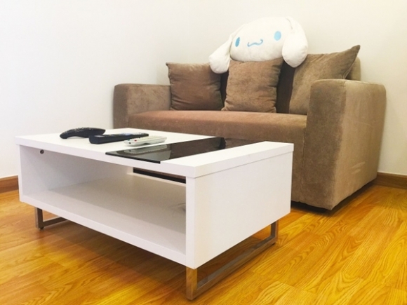 ติดกับโซฟาเป็นโต๊ะทำงานค่ะ ชั้นด้านบนวางพระที่นำมาจากบ้านค่ะ ส่วนลิ้นชักพลาสติกใต้โต๊ะ (ซื้อจากงาน Homepro Expo เหมือนกัน) เอาไว้เก็บของใช้ทำงาน