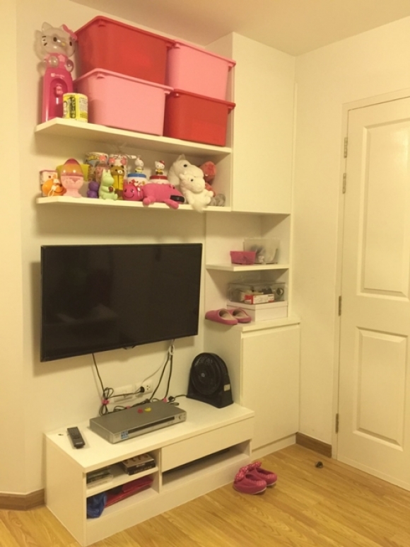 ฝั่งตรงข้ามกับโซฟา บริเวณเหนือทีวีเป็นชั้นวางของสะสมค่ะ ทั้งคิตตี้ มูมิน สะสมมาหลายปีแล้ว ส่วนด้านล่างไว้เก็บรองเท้าค่ะ แล้วก็เป็นสมาร์ททีวี 42 นิ้ว ของ Samsung ค่ะ ชิ้นนี้เพิ่งซื้อมาจากงาน Homepro Expo ลดราคา และผ่อน 0% ได้ด้วย (เสียดายซื้ออย่างอื่นที่ HomePro ไปก่อนแล้ว ถ้ารวม ๆ กันซื้อใน Expo น่าจะถูกกว่านี้ อ๊ากกกกกกก)