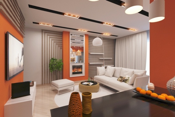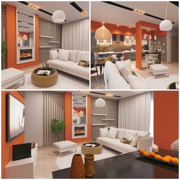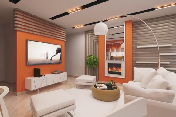 ห้องนั่งเล่นโมเดิร์น ตกแต่งสวย ๆ สไตล์โมเดิร์น โดยเป็น ห้องนั่งเล่นสีส้ม ที่ใช้ลายไม้เข้ามาเสริม ดูทันสมัยและคลาสสิกในคราวเดียวกัน