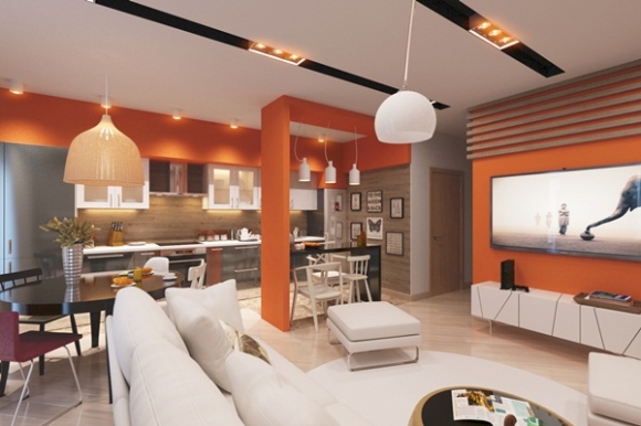 โดยเป็นการตกแต่งห้องนั่งเล่นที่เชื่อมต่อกับห้องครัว ด้วยโทนสีส้มสดผสมกับลายไม้ โดยมีลูกเล่นที่การกรุผนังไม้เป็นลวดลายสี่เหลี่ยม ทำให้ดูผนังมีมิติมากขึ้น พร้อมทำชั้นวางของไล่ระดับแบบง่าย ๆ วางโซฟาโทนสีอ่อนพร้อมปูพรมโทนสีเดียวกัน จากนั้นเพิ่มโคมไฟทรงโค้งยอดฮิต