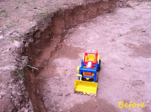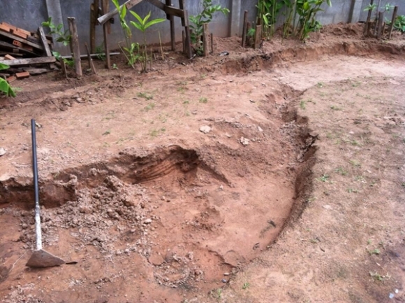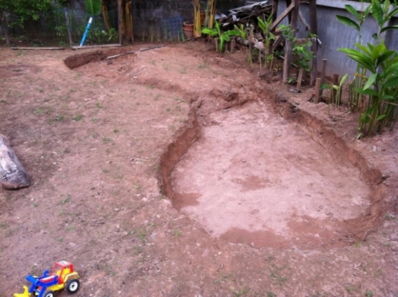 ดู ๆ ไปแล้วเหมือนงานปั้นบ่อมากกว่า ตรงไหนขาดก็โปะ ตรงไหนเกินทุบ รู้สึกว่าขอบบ่อจะเตี้ยไป (จากดินที่ขุดขึ้นไป) กลัวฝนตกน้ำจะไหลเข้าบ่อ แหะ ๆ เริ่มวางแผน เลยก่ออิฐเพิ่มความสูงซะ