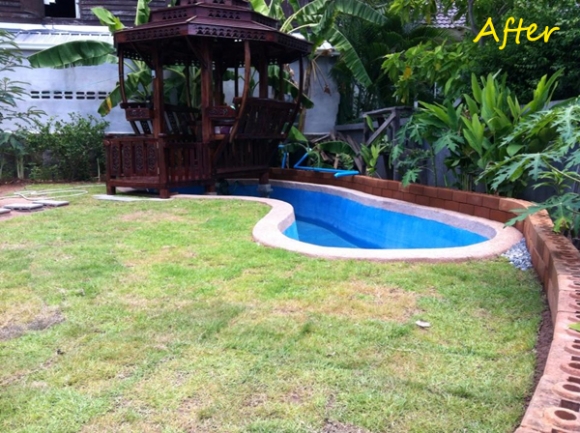 สงสัยฝนตกหนัก ดินเลยกระเด็นลงบ่อ เลยจัดหญ้ามาปูคลุมหน้าดินไว้ ส่วนด้านกำแพง ก็เอาอิฐประสานกันดินไว้ (หวังว่าจะได้ผลนะ)