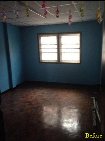 ภาพนี้เป็นสภาพห้องก่อนที่จะเริ่มรีโนเวทค่ะ ผนังสีฟ้าที่เห็นเกิดจากความหวังดีของคุณป้าอันเป็นที่รัก โดยตอนพี่ช่างมาทาสีบ้าน ป้าแกก็ให้ช่างทาในห้องให้ด้วย เห็นครั้งแรกนี่ถึงกับอึ้งเลย
