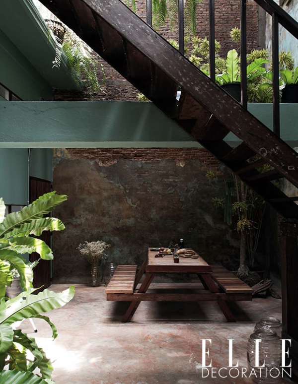 เจ้าของบ้านตั้งใจอยากให้พื้นที่ใจกลางบ้านมีบรรยากาศสวยงามสดชื่นแบบกรีนเฮ้าส์ จึงเป็นที่มาของการปลูกต้นไม้และรื้อพื้นที่บางส่วนของชั้นสองออก พร้อมการเจาะช่องแสง เปลี่ยนกระเบื้องหลังคาให้เป็นแบบโปร่งแสง เพื่อเปิดโอกาสให้แสงแดดสาดส่องมาสู่พื้นที่ด้านล่างได้อย่างทั่วถึง ส่วนผนังมีการขัดสีและกระเทาะกำแพงบางส่วนออก เพื่อสร้างความสะอาด สบายตา พร้อมเผยให้เห็นเสน่ห์ของอาคารเก่าแก่ที่มีความสวยงามเหนือกาลเวลา