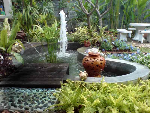 น้ำเป็นองค์ประกอบสำคัญที่ทำให้สวนดูสดชื่น ผ่อนคลาย มีชีวิตชีวา และดูร่มเย็น เหมาะกับการเป็นสถานที่พักผ่อนอย่างแท้จริง ดังนั้นควรมีที่สำหรับทำบ่อปลา บ่อน้ำเล็ก หรือน้ำพุในมุมเล็ก ๆ ให้มีเสียงน้ำเคลื่อนไหวอยู่รอบ ๆ ด้วย