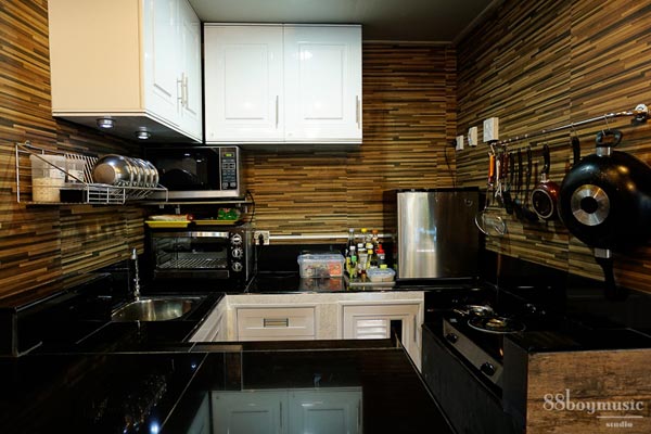 พื้นที่ที่มีคือ 2X2.05 เมตร สูง 2.5 เมตร ห้องครัวนี้เป็นความร่วมมือของคุณอาที่เป็นช่างปูนเก่า คุณพ่อเป็นช่างไฟ-น้ำเก่า และคุณสามีเป็นนักดนตรีเก่ามาช่วยกันทำค่ะ
