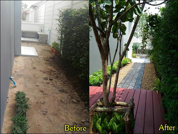 จัดสวนข้างบ้านทาวน์เฮ้าส์ บนพื้นที่แคบ ๆ แต่ก็จัดสวนให้สวยได้ แถมยังมีเทอร์เรซเล็ก ๆ ไว้นั่งพักผ่อนหย่อนใจ ด้วยงบประมาณ 3.5 หมื่นบาท