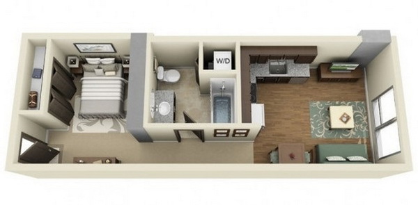 หลายๆคนอาจจะชอบห้องเล้ฏๆแล้วยังมีระเบียงด้วยแปลนนี้ถือว่าอาจจะเป็นตัวเลือกที่ใช้สำหรับคุณเลยด้วยพื้นที่ที่ๆจำกัดนั้นเราก็สามารถทำห้องให้ดูสวยขึ้นได้และดูดีขึ้นด้วยด้วย โซนของที่นอนจะถูกแยกออกจากห้องนั่งเล่น ครัวอย่างชัดเจนทำให้ไม่มีกลื่นมาคอยรบกวนโซนอื่นๆส่วนของพื้นที่นั่งเล่นนั้นอาจจะย้ายไปมุมที่ใกล้กับระเบียงเพื่อให้มองเห็นวิวด้านนอกได้จะทำให้เราผ่อนคลายมากขึ้นด้วย ห้องครัวนั้นถูกจัดให้เป็นลักษณะของตัวแอลได้อย่างลงตัว