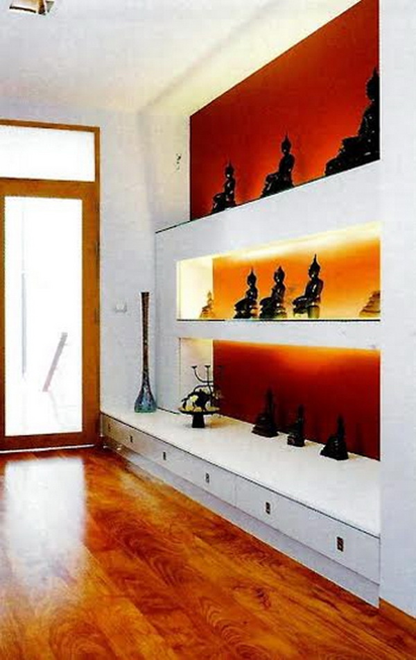 ผนังบ้าน ส่วนใหญ่มักทาด้วยสีขาวเช่นเดียวกับส่วนอื่นของบ้าน หากปล่อยไว้นานๆ จะมีคราบสกปรกเกาะติด ทำให้ผนังกลายเป็นคราบสีดำไม่น่ามอง การทาผนังด้วยสีอ่อน เช่น สีเหลืองอ่อนโทนพาสเทล หรืออาจกรุด้วยวอลเปเปอร์สีอ่อน โทนสว่างจะช่วยเปลี่ยนบรรยากาศภายในห้องพระให้สดชื่นขึ้นได้